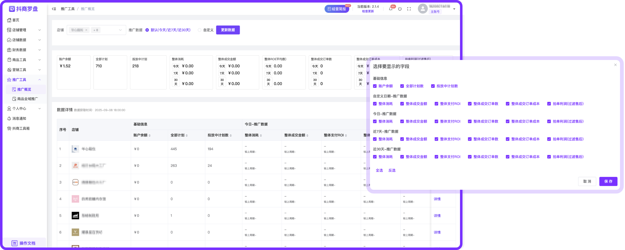 多维度数据看板,推广效果一目了然,全局概览:推广投入与产出清晰透明,随时掌握营销节奏;按店铺拆分推广数据,精准对比不同店铺的消耗、成交、ROI 表现,快速定位高潜力/待优化店铺,针对性调整策略,让资源向高价值业务倾斜。