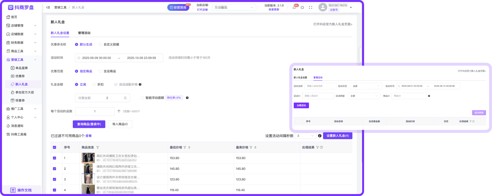 店群优惠券、单品直降、新人礼金创建情况